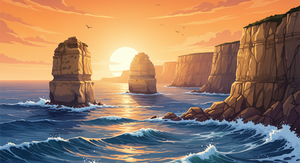 The iconic giants of the Great Ocean Road, glowing at sunset and standing strong against roaring waves.